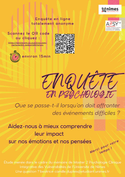 Etudiante en Master 2 de Psychologie Clinique Intégrative des Vulnérabilités à l'Université de Nîmes, Camille DUPLEIX réalise son mémoire de recherche en 2 ans sur la façon dont nous faisons face aux événements de vie difficiles, en étudiant leurs conséquences sur nos émotions et nos pensées (travail qui vise à être proposé à la publication dans une revue scientifique).